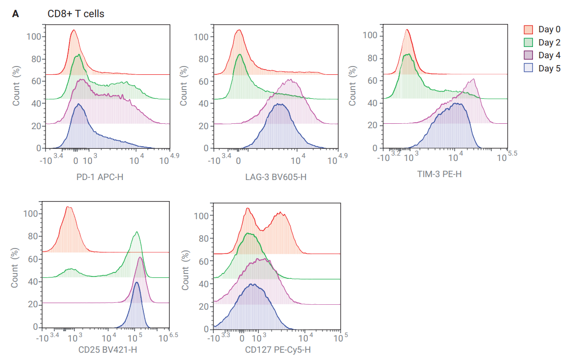 Exhaustion markers: Inhibitory receptors PD-1, LAG-3, and TIM-3 increased after sustained stimulation, reflecting early T cell exhaustion. Interestingly, their expression decreased again after restimulation, coinciding with a shift toward effector status.