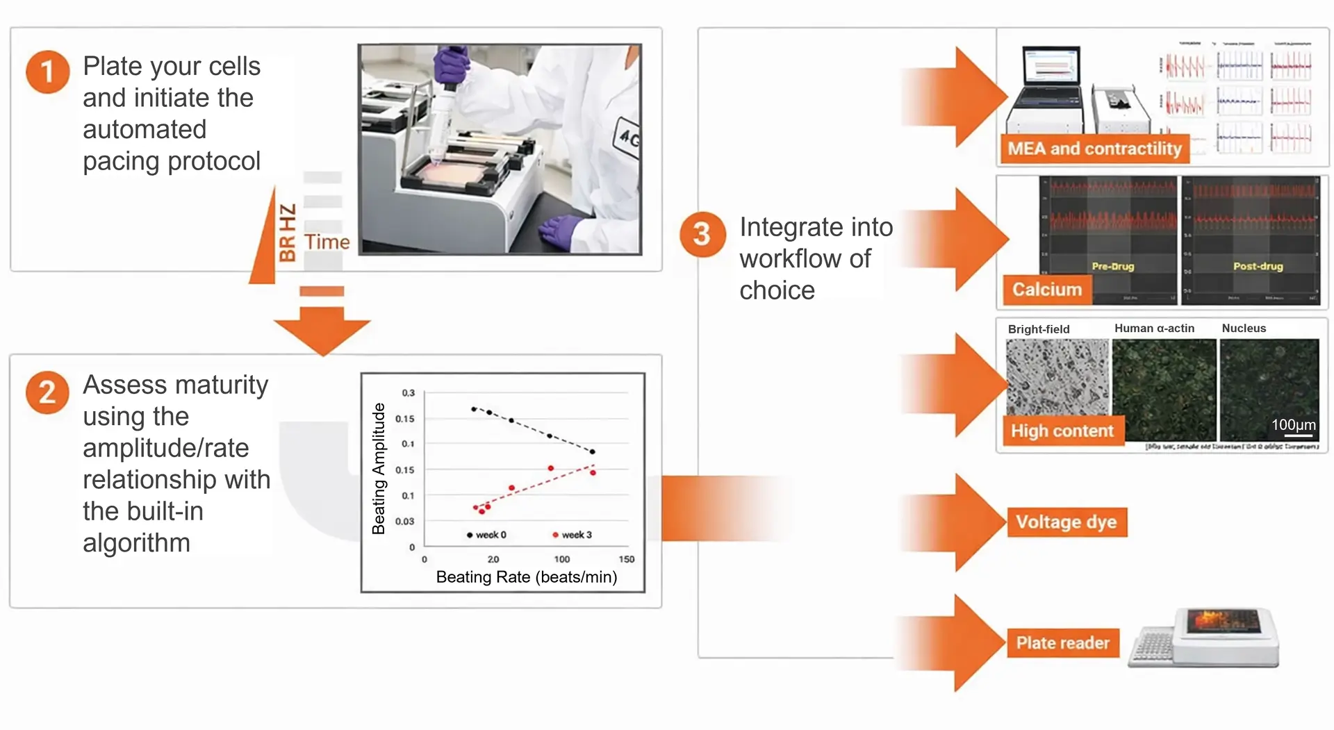 Compatible with MEA, contractility, calcium, HCS, voltage dye assays, and plate readers.
