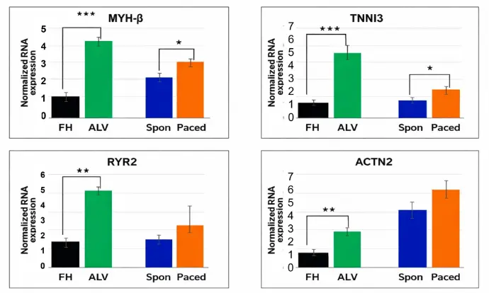 The expression of key maturation gene markers in non-paced (CTRL) and paced cardiomyocytes was determined by RT-PCR. The human fetal heart (FH) and adult left ventricle (ALV) were included as benchmarks of known level of maturation. The amount of RNA was normalized to the expression of GAPDH. Gene expression level was presented as a fold change to the human fetal heart. The data are presented as mean± SD, N=4. (* P< 0.05).