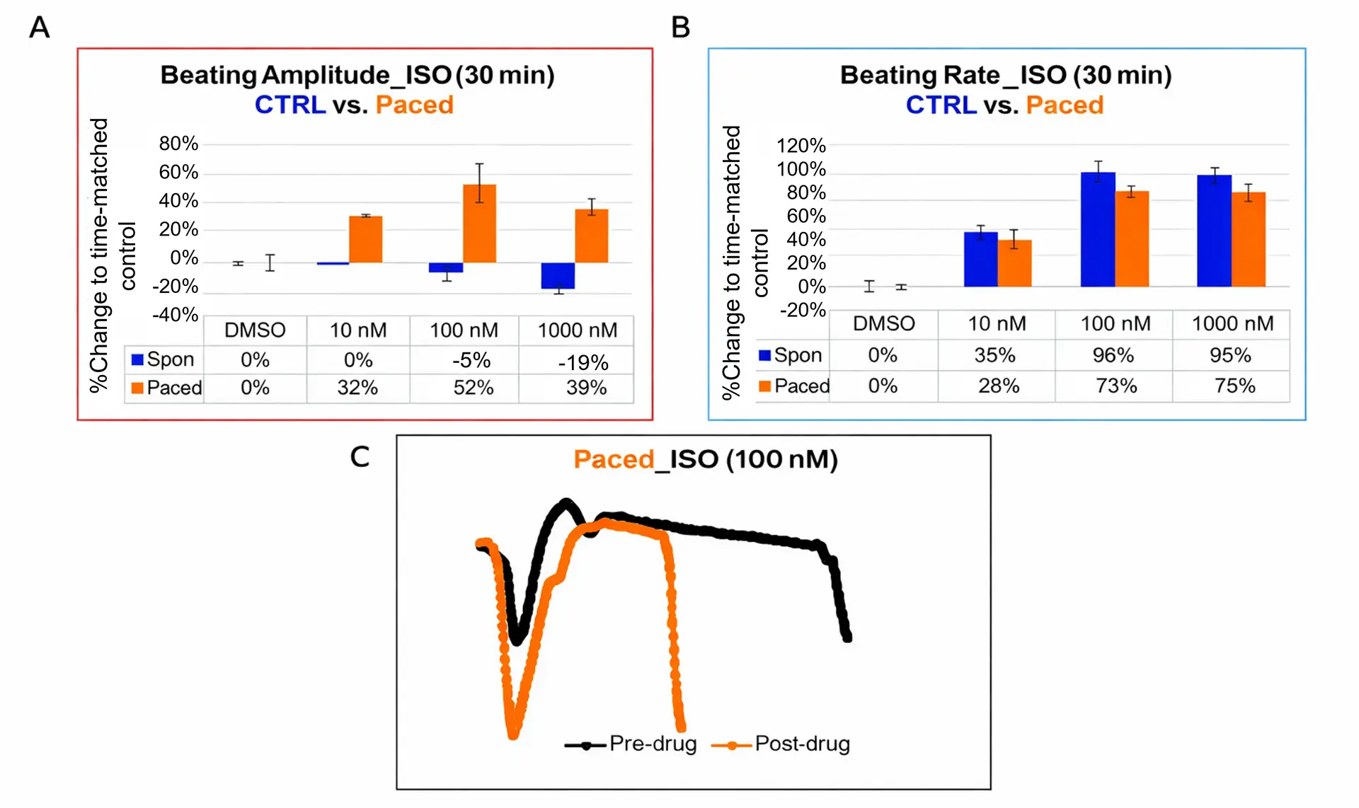 CTRL and paced cardiomyocytes were treated with isoproterenol (ISO; 10, 100, 1000 nM). Percentage changes in beating amplitude (a) and rate (b), normalized to time-matched DMSO controls, were measured 30 minutes post-treatment (CTRL: blue; paced: orange; mean ± SD, N = 3).