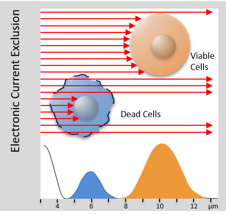 Viable cells are detected with full cell volume as their intact membranes provide a barrier for current.