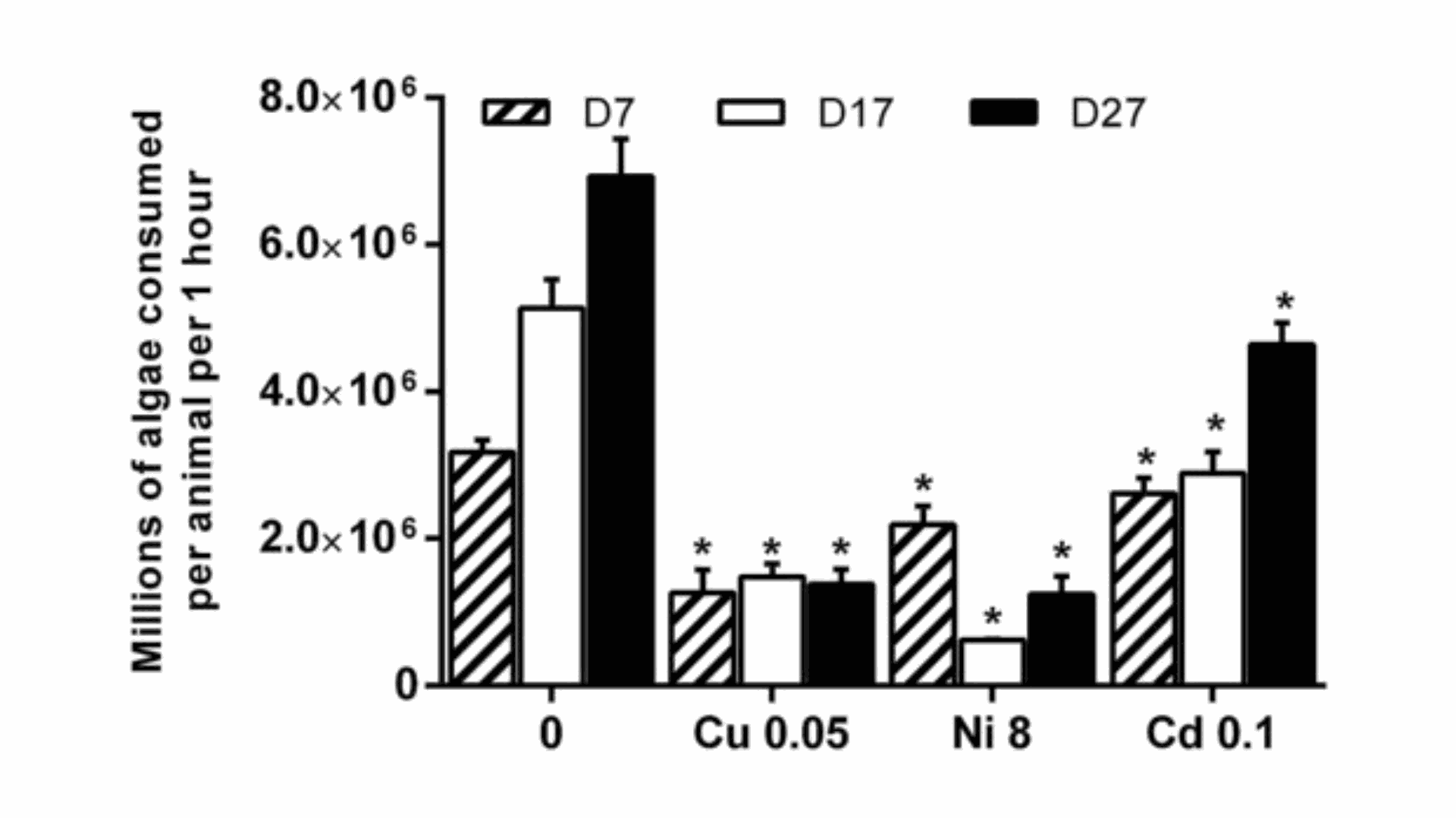 Fig. 2: Feeding rate was determined with daphniidsof different ages exposed for 24 hours to metal stress and the impact on algae consumption was assessed. Data represent average±SD (n=5). *Statistically significant effect of metal treatment relative to unexposed controls, conducted for each age group (ANOVA, p<0.05). Daphniidsage was 7 days (D7), 17 days (D17) and 27 days (D27).