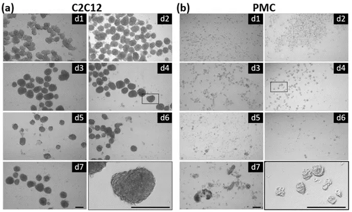 The CERO 3D Incubator and Bioreactorgenerates scaffold-free myospheres. By comparing spheroids derived from primary porcine muscle cells with those from C2C12 cells, the research examines differences in morphology, growth parameters, marker expression, and myogenic potential. This comparison provides valuable insights into the production and development of myogenic spheroids for various applications.