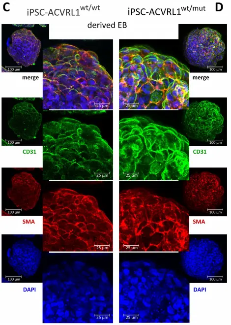 "Induction of endothelial differentiation in EBs. Depicted are confocal microscopy images of (A) ACVRL1wt/wt and (B) ACVRL1wt/mut EBs documenting the appearance of CD31+ cells after endothelial induction. Phalloidin was used to highlight the F (filamentous)-actin cytoskeleton, whilst DAPI was used to stain the nucleus. (C,D) Staining of EBs with an antibody directed against smooth muscle actin to detect possible pericyte structures."