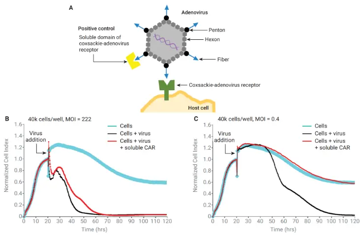 (A) Binding a soluble domain of coxsackie-adenovirus receptor (CAR) to adenovirus to neutralize viral activity. (B,C) Impedance response for 40k cells/well infected at MOI=222 or 0.4 after preincubation with or without soluble CAR.