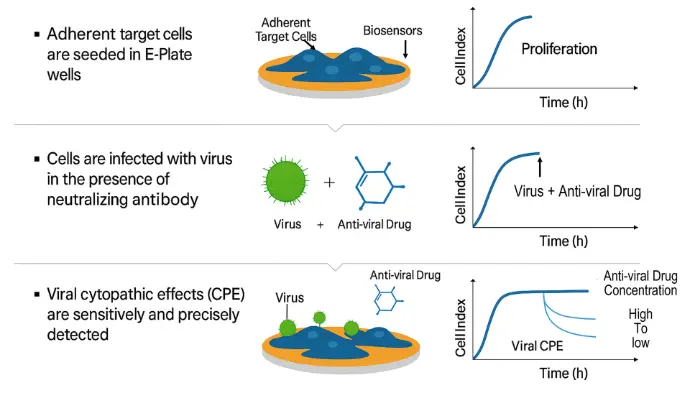 xCELLigence RTCA enables fast, sensitive detection of virus-induced cytopathic effects, allowing you to identify and characterize antiviral compounds across the entire viral life cycle. Simply plate target cells, add virus with test compounds at varying concentrations, and let the system automatically capture continuous, label-free kinetic data—eliminating the complexity and delays of traditional plaque assays.