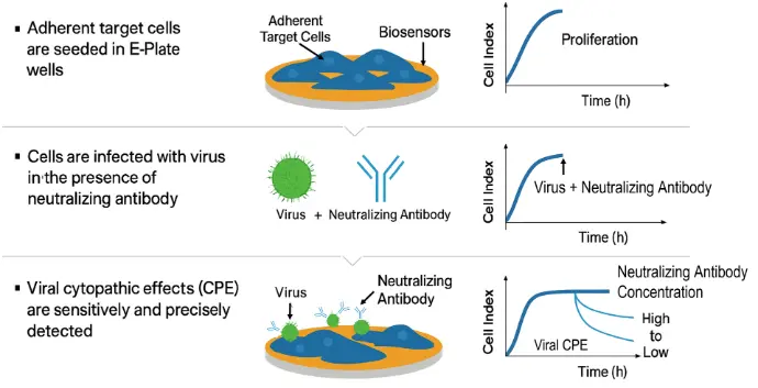 Replace labor-intensive PRNT assays with the streamlined xCELLigence RTCA workflow. Plate host cells, add virus together with the test antibody, and the system immediately begins acquiring data—no agar overlays, no manual readouts. Neutralizing activity can be detected within as little as one hour, delivering rapid and highly reproducible results.