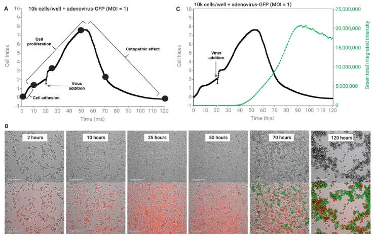 Combining eSight’s impedance- and image-based readouts to track the adenovirus-GFP cytopathic effect. (A) Tracking proliferation and cytopathic effect by impedance. (B) Brightfield, red channel (host nuclei) and green channel (virus-encoded GFP). (C) Impedance- and image-based detection.