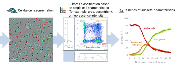 Continuously monitor and quantify single cell segmentation by label-free analysis. Gather cell count and nuclear fluorescent recognition count as a function over time. Measure cell subpopulations over time and gain insights into cellular heterogeneity.